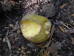 前回、焚火の跡にたまたま鍬を入れたら、灰燼の中から以前私たちが焼いて食べ忘れたらしいジャガイモが1個、出てきた。だれか食べるかな? と思ってその場にころがしておいたら、案の定、だれかが食べた。2匹で食べたのか、2回食べたのか。ちょっとかわいい 食べ残し状態のイモ。そのまま同じ場所にまだころがっています。また食べるのかな。前回鳥のえさ台にのせた ひまわりの種はすっかりなくなっていました。ツリーハウスのデッキにこぼしてしまった種もなくなっていました。でも今回ヤマガラを一羽も見ることができませんでした。前回は親鳥の声に混じって か弱い声がちょっと聞こえたんだけど。移植したシダ類は葉を大きく広げて生長中。自生のものも、この季節はぐんぐん大きくなって目を引きます。シダ類が好みそうな日陰の場所でまだほとんど整備してない場所があるので、早くきれいにして何か仕込まねば。