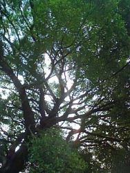 写真は、ひよどりが集まるクスノキです。鳥の声が賑やかに聞こえるのでお腹にも何かが届くかと、よく下を歩きます。