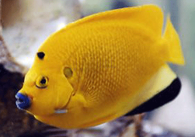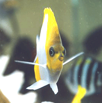 シテンヤッコ・15cm。口が汚れているのではないです。紫の口紅を塗りたくって、大きな瞳で見つめる。サンゴや岩の間をスイスイ・・・こちらの様子をうかがうひょうきんな瞳がなんともチャーミング!!!海の中では黄色は目立つ原色の中では地味な方ですが他の魚を引き立てている。すっきり淡い黄色のみのキイロハギとも友達みたいにくっついて泳ぎまわっている黄色をちりばめて海底を明るくしてくれるイルミネイションの役目を果たしてくれる仲間です。