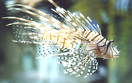 ソシアルダンスのドレスをまとい優雅に踊っているみたいに泳いでいるこれがミノカサゴ。山の中で育った私は何時もこの山の谷を飛びまわっているトンビをうらやましく思っていた。 水族館でミノカサゴを見た時、 ダイビングをやろうと、きっかけになった 私にとって思い出の魚です。冬でも夏でも海の中の景色を眺めながら泳いでいると空をまっている鳥達の気持ちになりきってしまいます。伊豆でダイビングしていると、よく優雅な舞に出会います。いつでもお相手しますって感じでじっと見つめられていたのを思い出す。ハンテングしている時は、岩など隅に小魚を追い詰め、めいっぱい羽を広げ逃げられなくし、大口を開けてすばやく一飲み!!! 優雅、夢、きっかけ造りになった事もいっぺんに吹っ飛んでしまう光景を見せられて、見た目で判断してはいけないと教えてくれます。このカクレクマノミ達も動きが鈍いのでいつも狙われている自分よりゆっくりしていると思って油断するなよ!!!