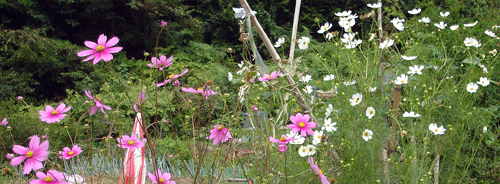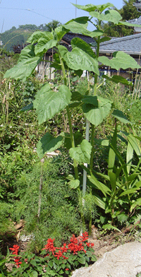 1週間たってやっと腸の調子がもどってきた感じがする。 回復の遅さにがっかりする。でもやっとニャンと一緒に笑って美味しく食べられるようになった。 この畳3枚の畑の手入れが、今の所自分のリハビリです。 きゅうり、なす、ピーマン、ししとう、アスパラを毎日収穫して取立ての野菜を食している。野菜の合間に花も咲き乱れだした。 コスモスも咲き始めた。朝顔も。百日草はまさっかり!!! 春菊も二人の胃袋では余ってしまい、 黄色の花見になってしまった。 きゅうりも黄色の花盛り!!! 人間の弱さを痛感した。無理なく自然の中で自然に鍛えねば・・・小さな畑で野菜も花も草花も味わい、囲まれていると、虫も蜂も優雅なアゲハチョウも皆仲間に思えてくる。犬も猫も・・・狸も・・?