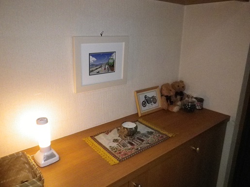 あまり気にしてなかったんだけど少しずつ家の模様替えしてみようかな・・・と思ってたんだまずは、玄関からイメージはセンサーライトを置いて小さな絵(リトグラフ)を飾るシンプルな感じということで、重い腰を上げて、池袋まで行ってみた玄関 こんな感じになりましたセンサーライトは、人感自動点灯、緊急時には、懐中電灯にもなるよ欲しかったリトグラフは、お高くて入手出来ず・・・だって、欲しいなぁって思った奴は、3万円、高いのは10万円もするんだよ無理だってと、いうことで、ポストカードで我慢しましたでも、江ノ島、江ノ電、富士山と、サーフボード 良い感じでしょ?