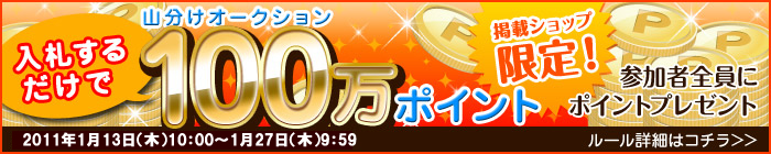 ▼入札するだけで100万ポイント山分け対象商品6今回の100万ポイント山分けのキャンペーンページは下記からご覧になれます。★入札した方全員にポイントをプレゼント!100万ポイント山分けオークション♪今すぐ入札★企画に参加している店舗のスーパーオークション商品に1月13日(木)10:00~1月27日(木)23:59の間に入札すると、100万ポイント山分け対象者になります♪複数店舗で入札すれば、入札するほど、ポイントがもらえます。例) 同じ店舗で、2商品に入札した場合 応募口数1つ 2つの店舗で、1商品づつ入札した場合 応募口数2つ今回、写真付きで紹介予定でしたが、多数の対象商品があるので、ショップリンクを掲載しています。クローズド商品じゃないものもありますので、入札価格が上がっていている場合の入札は、よく検討してからにしましょう。中には、1円から大量出品している店舗もあるので、上手くいけば、1円落札、安く落札できる商品などもあります。ショップリンクもあわせて活用してみてください。■100ポイント山分け商品掲載ショップ一覧■【宝箱】株式会社パーパスGLOCCA BY COLLECTORSヒットパレードハッピーライフこだわり・ほんものSHOPTHE SHOP BIOSMY CLOSETホビーショップ マルヒチハンマープライス建築のプロの御用達ショップ十兵衛イストショップ楽天市場店じゅえりぃ ばんくワールドゴルフ旬の魚と釜めし いちえトレンドワンディスカウントキララ山形のお米とさくらんぼの矢萩商店ショップワールド楽天の会員じゃない方は、無料ですので、登録して、オークションを楽しみましょうオークションを利用した事が無い人などは不安もあると思うので、わかりやすく図解されてます。そのページの下の方に会員登録があります初めての楽天オークションTOPへ
