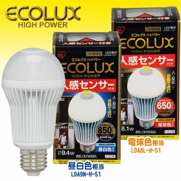 LED電球「ECOLUX LDA9N-H-S1」 人の体温を感知すると自動点灯する人感センサーを搭載し、センサー感知範囲から離れると約5分後に自動消灯する仕組み。製造/販売アイリスオーヤマ製品情報LED電球「ECOLUX LDA9N-H-S1」価格比較ここをクリック 段階的に明るさが落ちる「ゆるやか消灯」、暗い時のみ人感センサーを作動させる明暗センサーといった特長もある。ラインナップ60 ワット形・昼白色相当LDA9N-H-S150 ワット形・電球色相当LDA8L-H-S150 ワット形・昼白色相当LDA7N-H-S240 ワット形・電球色相当LDA5L-H-S240 ワット形・昼白色相当LDA5N-H-S330 ワット形・電球色相当LDA5L-H-S3