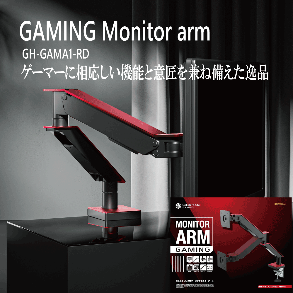 ガススプリング式ディスプレアーム「GH-GAMA1-RD」 ゲーム向けをうたったガススプリング式ディスプレアーム製造/販売グリーンハウス製品情報ガススプリング式ディスプレアーム「GH-GAMA1-RD」価格比較ここをクリック VESAマウント(75mm/100mm)に対応したディスプレイアーム。17~35型ディスプレイに対応したモデルで、耐荷重は2.5~11kgとなっている。軽い力で位置の変更が可能なガススプリング式を採用しているのも特徴だ。天板への固定はクランプ式/グロメット式に両対応。アームの回転範囲を180度で固定して壁面の傷つきなどを防止できる回転ストッパーも備えた。