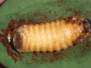 M様から譲っていただいたタラニョロで1匹だけものすごく成長が遅い子がいたんですね。10月始めに交換した時の体重は12g・・・来た時とまったく変わってないんですよ。その子の姿がまったく確認できなくなったんで様子を見ようと掘ってみたら・・・蛹化の真っ最中・・・orz下半身は蛹ですが上半身はニョロの状態で出てきました。この状態で出てきた子は確実に★になってます><M様すいません。もう気になっても掘るのはやめようと思います。