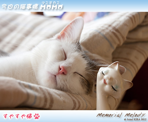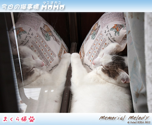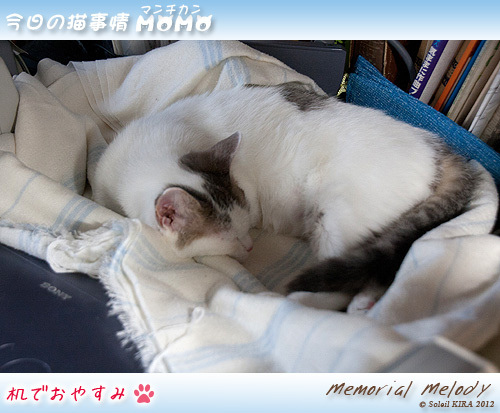 6月12日 のち雨数日前、気温が低い肌寒い日に、何か、もぞもぞやってるなと思っていたら、ドテンと机の上で丸まって寝てしまいました。こんなところで寝ることはいままでなかったけど・・・どうせ使ってない机だしと折りたたんだシーツを敷いておいた。そして、今日も雨降りの肌寒いお天気。いつもどおり日向ぼっこポイントへ行くも、また机の上にのってきた。もしやと思いきや、やっぱり寝た。いつものベビーラックで寝たらいいのにと思ったが放っておいた。まさに猫は気まぐれですね。寝場所は必ずしも同じ場所ではなく、何かをきっかけに移動したりします。そんな時は、ベッドを移動してあげればグッド!バスタオルや毛布を敷くなど、簡単なベッドで充分ですね。ランキングに参加してますポチッと応援してくれると、とってもうれしいです!↓にほんブログ村 写真ブログ人気の写真ブログもチェック!写真共有サイト「フォト蔵」《 2012/6/11 |記事一覧|2012/6/13 》■今日の猫事情
