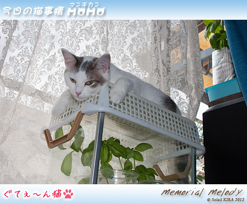 6月30日 晴れ暑いよね~。家庭菜園でバジルを栽培しているのですが、この棚の上でどうしても日向ぼっこがしたいのか上にのってしまうので、仕方なく上にカゴを載せてやったらこんな感じで上にのって寝ています。だけど、暑くなってしまったのか猫ちゃん、ぐったりな状態。。。なんか目もうつろなんだけど。暑いのならもう少し涼しいところ探せばいいのに~。かわいそうなのでエアコンスイッチON!真上からの写真も面白い。ランキングに参加してますポチッと応援してくれると、とってもうれしいニャン!↓にほんブログ村 (猫ブログ)猫のいる暮らしクリックするだけで投票できます。投票後はランキングページに移動されます。写真共有サイト「フォト蔵」◆猫雑貨・猫グッズ愛犬愛猫ネーム入りツインステッカー当店人気の一押し!多頭飼いさんにオススメ★組み合わせ自由に作れるオリジナル犬猫ステッカー!価格 3,000円 (税込) 送料別SHOP:エブリーペット 猫のおやつ 猫ちゃんが大好きなのはこれ!?ママクック フリーズドライのササミ 猫用 180g 【在庫限り】特殊製法[DFD製法]で中身の美味しさ(肉汁)をそのままとじこめて乾燥させました。チャオ 焼かつお かつおミックス味 15本土佐清水で水揚げされた、大変新鮮な宗田かつおを香ばしく焼き上げました。緑茶消臭成分配合。ペティオ・キャットSNACK【超徳用 乾しカマ・かに】140gカマボコとかににタウリンをプラスした体にうれしいスナック!モンプチ クリスピーキッス シーフードセレクト 30g本当においしいものを少しだけ。モンプチ初のおやつ新登場。よく噛んで歯の健康も。《 2012/6/29 |記事一覧|2012/7/01 》■今日の猫事情