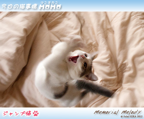 6月14日 晴れジャ~ンプ!ももちゃんは、飯より遊びが好き!そんな感じだが、さて野生度は?「ねこのきもち」にあったのでチェックしてみた!・高い場所にある物を前足で落とす・窓の外に鳥や虫がいるとじっと見る ○・1匹でもおもちゃなどでよく遊ぶ ○・テレビの映像を目で追う・段ボール箱などがあると、興味津々で中に入る・早朝または夜に、突然ダッシュすることがある ○・ビニール袋など「カサカサ」という音に反応する ○・荷造りのひもや靴紐などにじゃれて遊ぶ ○・パソコンを操作したり書き物をする飼い主さんの手にじゃれる・寝ていたり、歩いている飼い主さんの足に飛び付く ○チェック数0~2:野生度弱(のんびりタイプ)チェック数3~6:野生度中(うきうきタイプ)チェック数7~10:野生度強(狩人タイプ)6個が当てはまるかな。野生度、中 でも、強に近いうきうきタイプ!あと1つで狩人タイプやな!このタイプは、遊びを通じて、かまってもらえるのが幸せな猫ちゃん。甘えん坊な猫に多い傾向ということで、まさにそうかも。短時間でもいいから、じゃらして遊んであげるとうれしそうです。ランキングに参加してますポチッと応援してくれると、とってもうれしいです!↓にほんブログ村 写真ブログ人気の写真ブログもチェック!写真共有サイト「フォト蔵」◆猫雑貨・猫グッズUV付き おめめつぶったネコ 長傘 晴雨兼用3色あります★ドット柄とかくれんぼネコちゃんが可愛い♪紫外線対策もバッチリなUV付き晴雨兼用長傘です 価格 2,900円 (税込 3,045 円) 送料別SHOP:薔薇雑貨のおしゃれ姫大人気【送料無料】北海道 富良野産 富良野メロン【JAふらの保証/共撰/秀品】ジューシーな赤い果肉♪北海道グルメーション著名人御用達の老舗が選んだ!岡山プレミアム白桃≪創業99年の信頼と実績!≫ネット限定の特別価格で!志ほや甘くてとろけるような食感!宮崎県産完熟マンゴー 一度食べると虜になる美味しさ!国産マンゴーの最高級品果実庵お中元特集2012 フルーツ・果実・野菜《 2012/6/12 |記事一覧|2012/6/14 》■今日の猫事情