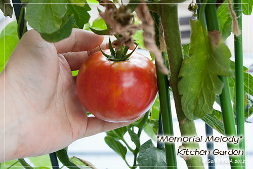 7月27日 晴れ大玉トマト「甘熟王」です。やっと真っ赤に完熟!冷やしてそのまま頂きましたが、色が濃く、味も濃いし甘みもあり美味しかったです。このもう1つ上にも大きなトマトで完熟したのでそれはスープに入れて頂きました。しかし、今回収獲できたのはほんのわずか。尻腐れ病でトマトの中央部分が腐ったような感じでへこみ、茶色く変色してしまったものが多く失敗!尻腐れ病の原因は土にあるようで、原因は「カルシウム不足」ということ。天然石灰でカルシウムを補ってやればよかったらしいです。東商 有機1坪石灰 500g こういったものが必要だったようです。そろそろ、ミニトマトの方も終わりかな~といった感じです。だけど、ミニトマトはたくさん収獲できたし、良しとしますか!《 2012/7/26 |記事一覧|2012/7/28 》■家庭菜園 - ベランダで野菜栽培できるかな