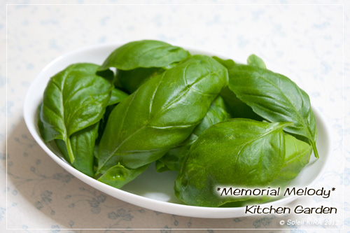 7月29日 晴れペットボトルで栽培しているバジルです。たくさん収獲できればバジルペーストでもつくるのですが、今のところそれほど採れそうもないしということで、試しに大きくなったバジルの葉を数枚冷凍保存してみることに。葉は水洗いせずに拭く程度にして冷凍するのがいいらしいのですが、やっぱり気になるので洗いました。そして、手早くキッチンペーパーでよく水分を拭きとりました。写真は洗った後のもの。保存容器に入れて冷凍させればOK!今回は、ジップロックに入れて冷凍してみました。すぐに凍ってしまいましたが、洗ったあとによく水分も拭きとりましたので、ちゃんと1枚1枚でくっつかずに冷凍できました。アルミ容器に入れたり、アルミのトレーに載せて冷蔵庫の瞬間冷凍の機能を使うのが一番いいのかな。またやってみよ~。 《 2012/7/28 |記事一覧|2012/7/30 》■家庭菜園 - ベランダで野菜栽培できるかな