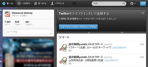Twitter公式ページを開いたらいつもと違う画面が!「Twitterをライフラインとして活用する」と表示されていました。そういえば、『災害時における情報検索サービス「Twitterライフアカウント検索」を国内向けに提供』という記事を読んだことを思い出しました。今回新たに、Twitter公式ページより「#見つける」をクリックすると左側の項目に「ライフライン」が追加されていることがわかります。ライフラインをクリックすると郵便番号を入力する検索ボックスが現れ、こちらを利用するとその郵便番号に該当する地域に関連した災害情報を発信するアカウントに絞り込んで表示してくれるという機能です。試しに自分の地域の郵便番号を入力して検索してみると・・・東京都庁広報課、東京都水道局、東京電力、○○区広報課、東京消防庁などTwitterアカウントが表示されました。フォローしておくことで災害時に信頼出来る情報を効率的に収集できるというわけですね。試しに東京以外の郵便番号を入れてみたのですが、現在のところ地域によってはかなりしょぼい。つまり、その地域に関連したTwitterアカウントが少ないのだ。今後、アカウントがつくられることに期待ですね。しかし、アカウントだけ存在していても意味がないわけで、災害時にどれだけ迅速に正確な情報が発信されるかが重要なところ。3.11の震災の時もデマが拡散するなどインターネット情報の質や信頼性はとても大きな問題になりました。ライフラインアカウント検索で絞り込まれるアカウントは信頼性が高いということはわかりますが、実際に災害が発生した際にTwitterのメリットでもあるリアルタイム性をどれほど活用できるか、どれほど迅速に必要な情報が発信されるか、それは管理者しだいですかね。ライフラインアカウント検索:地域の災害情報を得るために30分で達人になるツイッター(青春文庫)twitterレシピ たった140文字でパスタもデザートも。Twitterをスマートに使いこなす基本&活用ワザ100(できるポケット)Twitterでビジネスを加速する方法 楽天市場で本・雑誌・コミックを探す 本・雑誌・コミック 売れ筋人気ランキング