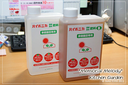 9月20日 晴れ水耕栽培用の肥料が切れてしまったので貯まった楽天ポイントを利用して購入しました。前回は、ポイントがあまりなくて500mlの小さいサイズを買ったのですが、オクラ、ミニトマト、ピーマンと、けっこう培養液を必要として思ったより早くなくなってしまいました。今度は、1Lあるのでしばらくもつと思います。【ハイポニカ肥料】ハイポニカ液肥1000ml(1L)セット(A液・B液/各1000ml) 水耕栽培液肥用に配合された液体肥料です。(土耕栽培にも同じように希釈してご利用になれます。)価格 1,680円 (税込) 送料別配送料:全国一律480円ショップ:エコショップ節水村 楽天市場店ハイポニカ肥料は近所のホームセンターなど探したこともあるのですが、扱っておらずいつも通販で取り寄せています。送料が比較的安いお店を探したのでそちらで注文!あす楽対象商品だったので翌日には到着!迅速な対応で助かります。A液とB液が2本で1セット、野菜の栽培にはA液・B液とも500倍にうすめて使用します。なのでとっても経済的!土用の液肥で水耕栽培をすると養分が不足する場合がありますが、ハイポニカなら水耕栽培でも植物が必要とする栄養素がすべて入っていますので元気に育ちます!最近は、2つの液を混ぜる必要のない水耕栽培用の肥料もあるのですが、ちょっとお高いのでこちらを使っています。そろそろリーフレタスなどの葉物野菜の栽培もしたいな~と思っています。ハイポニカ1L液体肥料 お得!ホームハイポニカ液肥1リットル/1000ml 水耕栽培用ですが、土栽培でも使用可能。HB-101 100cc 天然活力剤 HB101 あらゆる植物の栽培に威力を発揮する、万能の活力・活性液です。万田酵素アミノアルファ 500ml 植物の光合成を活発にし、植物本来の生命力を引き出す植物活性剤です。ペンタガーデン PRO 350ml ALAの働きで、日陰や寒さでもすくすく育ちます。花壇・プランター・観葉植物・家庭菜園などさまざまなシーンで 楽天市場で肥料を探す ◎こちらの肥料売れてます! 売れ筋人気ランキング《 2012/9/19 |記事一覧|2012/9/21 》■家庭菜園 - ベランダで野菜栽培できるかな