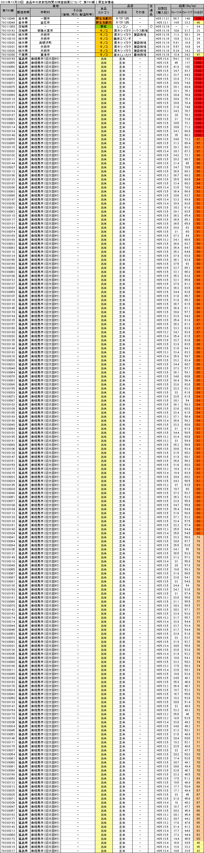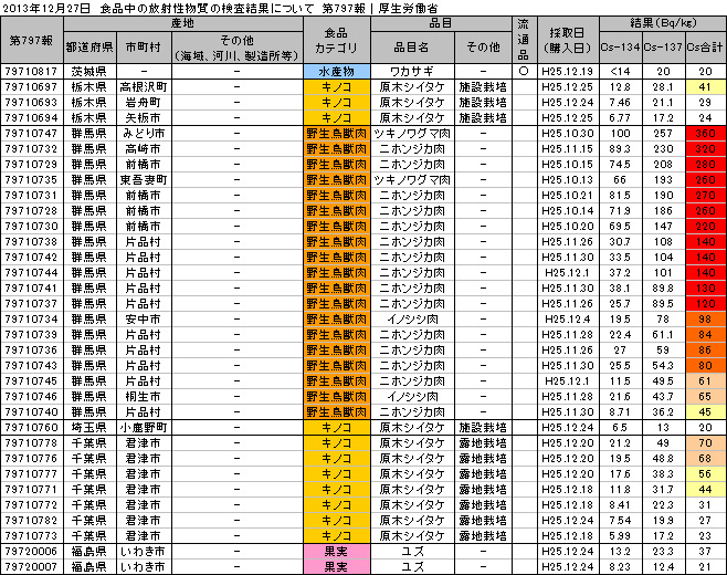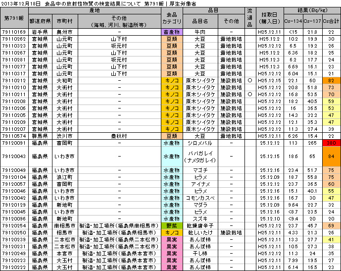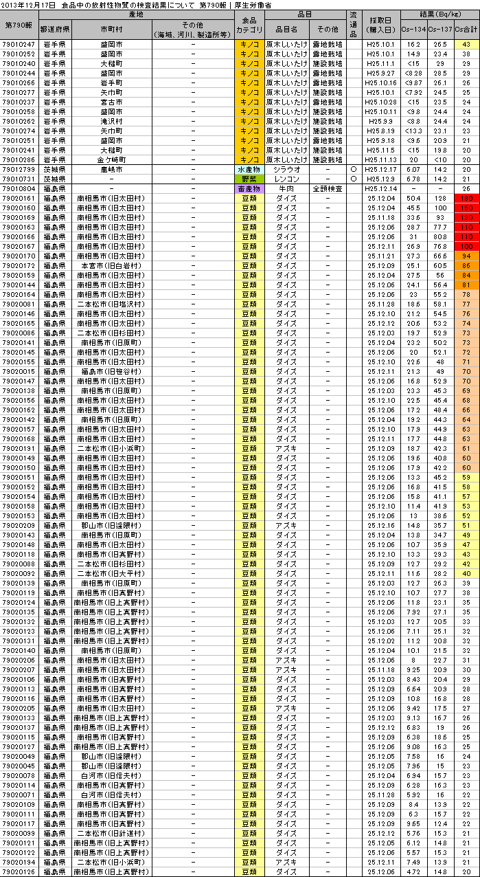 食品に含まれる放射性セシウム濃度の検査結果12月20日、厚生労働省から発表された食品中の放射性物質の検査結果。※検出限界値25Bq/kg未満で不検出:牛肉、京都府産農作物、愛媛県産ノリ・ 食品中の放射性物質の検査結果について(第793報) 表はクリックで拡大↓【基準値超過】(最大値)岩手県産ヤマドリ肉 Cs:200 Bq/kg福島県産玄米 Cs:180 Bq/kg流通品の検査で放射性セシウムが検出された食品茨城県産レンコン(報告自治体:大阪市) Cs:24 Bq/kg福島産米「ひとめぼれ」から、また基準超過セシウム検出、出荷停止 福島県の詳細検査で判明 ”準汚染”米は市場に流通Finance GreenWatchより 2013年12月21日 配信http://financegreenwatch.org/jp/?p=39429作付再開準備区域である南相馬市旧太田村で生産された25年産米198検体のうち、15検体(5農家分)から、食品基準値を超える110~180ベクレルの放射性セシウムを検出した。これらの汚染米は出荷停止されるが、50ベクレル~100ベクレルの”準汚染”米は、全量、市場に出荷される。要注意!!基準以下の米も高い値を検出しています!【原発関連ニュース】東電除染 国が全額肩代わり 国民負担、追加の恐れ東京新聞より 2013年12月21日 7時04分配信http://www.tokyo-np.co.jp/s/article/2013122190070144.html政府は二十日、除染費用三兆六千億円を全額、国の負担とするなど新たな東京電力への支援策を正式決定した。除染費用の大部分に政府が保有する東電株の売却益を充て、東電の負担分を最終的にゼロとする仕組み。だが、政府のもくろみ通りに東電株が値上がりしなければ、追加の国民負担につながる恐れがある。東電への新たな支援策の柱は、賠償や除染の資金支援枠を現行の五兆円から九兆円に拡大した上で、除染費用に関しては全面的に国が負担する。まだまだ、これからですよ、泥沼劇は。福島市が共同開発に着手 乳幼児向けホールボディーカウンター福島民報より 2013年12月21日 11時08分配信http://www.minpo.jp/news/detail/2013122112861ゼロ歳児から測定できる乳幼児向けのホールボディーカウンター(WBC)の開発に着手平成26年度中に試作品を完成させ、実用化を目指す。廃炉・汚染水対策で社内分社化 東電、来年4月に 増田第二原発前所長が最高責任者福島民報より 2013年12月21日 11時26分配信http://www.minpo.jp/news/detail/2013122112875東京電力は20日、福島第一原発の廃炉と汚染水対策部門を社内分社化した「廃炉カンパニー」(仮称)を来年4月1日付で設置すると発表した。全基廃炉の意見書可決 大熊、双葉両町議会 第一、第二原発福島民報より 2013年12月21日 11時41分配信http://www.minpo.jp/pub/topics/jishin2011/2013/12/post_8876.html大熊、双葉両町議会の12月定例議会は20日、それぞれ最終本会議を開き、県内の全原発廃炉を求める意見書をともに賛成多数で可決した。・・・方針の決まっていない福島第二原発について、立地町の楢葉、富岡両町を含め隣接する4町で廃炉を求め足並みがそろった。地中壁外側の井戸水から過去最高値の放射性物質読売新聞より 2013年12月21日 13時30分配信http://www.yomiuri.co.jp/science/news/20131221-OYT1T00510.htm東京電力は21日、福島第一原子力発電所2、3号機近くの護岸で、汚染水をせきとめる地中壁より海側にある観測用井戸で20日採取した水から、放射性ストロンチウムなどベータ線を出す放射性物質が1リットルあたり270ベクレル検出されたと発表した。汚染水が染み込むのを食い止めるとされている難透水層の下の層から放射性物質を検出したのは初めて。福島第一港湾内、放水口付近、護岸の詳細分析結果採取日:12月20日地下水観測孔:No.2-7全ベータ:270Bq/L(12/8 22Bq/L)福島第1、地下深い層から放射性物質検出日本経済新聞より 2013年12月20日 23時20分配信http://www.nikkei.com/article/DGXNASDG2005R_Q3A221C1CR8000/東京電力は20日、福島第1原子力発電所4号機の海側地下25メートルの深い層の地下水から、ストロンチウム90などベータ線を出す放射性物質が1リットル当たり89ベクレル検出されたと発表した。東電、55歳以上の全役職者投入 福島復興を加速千葉日報より 2013年12月21日 0時19分配信http://www.chibanippo.co.jp/newspack/20131221/171664東京電力が、55歳以上の一定の役職社員を原則として全員、福島第1原発事故に伴う福島県内での復興業務に投入する方向で検討していることが20日、分かった。・・・東電は組織の効率化の一環として10ある支店を全廃し、それに伴って出る千人程度の人員を福島の復興業務に充てる方針。原発事故関連・食品の放射性物質検査