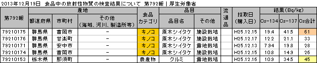 食品に含まれる放射性セシウム濃度の検査結果12月4日、厚生労働省から発表された食品中の放射性物質の検査結果。※検出限界値25Bq/kg未満で不検出:牛肉、一部の宮城県産農産物・畜産物・加工品、奈良県産精米・ 食品中の放射性物質の検査結果について(第791報) 表はクリックで拡大↓【基準値超過】(最大値)福島県産シロメバル Cs:380 Bq/kg流通品の検査で放射性セシウムが検出された食品宮城県大和町産 原木シイタケ Cs:82 Bq/kg宮城県大衡村産 原木シイタケ Cs:70 Bq/kg福島県産りんごジュース Cs:5.7 Bq/kgなどシイタケは流通品でこのレベルですからね~。アカン!内部被曝では局所に密集して放射線を受けるわけで、何ベクレルであろうが、体内に入ってしまえば、その周囲は「高線量」ということになるのでは。【原発関連ニュース】4割で水底土壌8000ベクレル超 避難区域の農業用ダム福島民報より 2013年12月19日 8時27分配信http://www.minpo.jp/news/detail/2013121912813農林水産省は国直轄除染エリアの避難区域内の農業用ダム・ため池262カ所で放射性物質検査を初めて実施し、約4割に当たる108カ所の水底の土壌(底質)から指定廃棄物(1キロ当たり8000ベクレル超)に相当する放射性セシウムが検出された。【東北農政局】福島県内のため池等における放射性物質の調査結果について三井住友、東電融資に応じる意向 全銀協会長が表明47NEWSより 2013年12月19日 18時41分配信http://www.47news.jp/CN/201312/CN2013121901001966.html東海原発:廃炉5年遅れに 解体後の処分地なく毎日新聞より 2013年12月19日 21時48分配信http://mainichi.jp/select/news/20131220k0000m040104000c.html日本原子力発電は19日、国内初の商業炉で廃炉作業中の東海原発(茨城県東海村)について、来年度から始める予定だった原子炉の解体工事を5年間延期すると発表した。これに伴い、廃炉の完了期も2020年度から25年度に遅れる見込み。解体で出る放射性廃棄物をどのような容器に入れるかが決まっていない・・・やったらやりっぱなし。解体イタシマセン!後始末デキマセンとか、ありえないでしょ!!『原発ホワイトアウト』登場人物のモデルとなった新潟県知事を直撃日刊SPA!より 2013年12月19日 配信http://nikkan-spa.jp/555175日本の技術委員会の議論を聞いていると、「メルトダウンが起きる」という前提の議論をしていないのです。メルトダウンがいかに起きないのかを必死で説明している。これは第二の安全神話を作るのにほかならないし、政府全体で原発輸出をしたら製造物責任を問われる事態を招きかねない。すべては理屈ではなく利権である。原発ホワイトアウト著者/編集:若杉冽キャリア官僚による、リアル告発ノベル! 『三本の矢』を超える問題作、現る!!再稼働が着々と進む原発……しかし日本の原発には、国民が知らされていない致命的な欠陥があった!この事実を知らせようと動き始めた著者に迫り来る、尾行、嫌がらせ、脅迫……包囲網をかいくぐって国民に原発の危険性を知らせるには、ノンフィクション・ノベルを書くしかなかった!原発事故関連・食品の放射性物質検査
