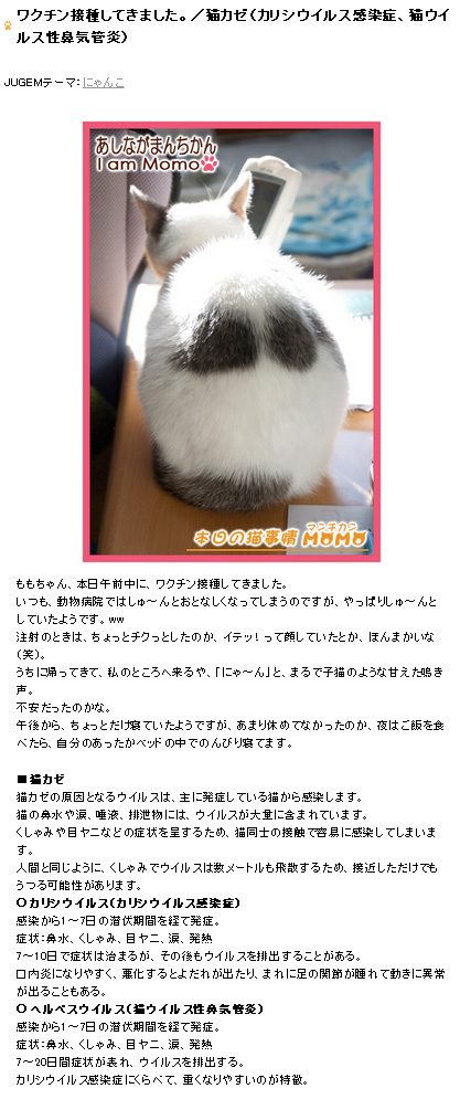 今日、猫の予防接種が終わりました。ももちゃんは、普段は家の中での生活で、ちょこっとベランダをお散歩する程度なので、感染のリスクはそれほど高くないにしろ、やっぱり野良猫が多いので、予防接種しておけばとりあえず安心。動物病院では体重も測定したようですが、やっぱり変わってませんでした。体重管理はしっかりできています。体が大きく見えてるのはやっぱり冬毛でモコモコしているからですね。それと、尿検査を無料でしてくれるらしく、後日、採取できたら持ってきて下さいということのようなのですが・・・どうやって、採取するんだよーーー!普段、ドライフードのみなのですが、今日はモンプチのウェットフードも食べて寝ちゃいました。たまに、ウェットフードとかあげると美味しいのか、夢中になって食べています。~フィッシュ大好きモンプチセット~ フード28種 おまけ付き キャットフード●フィッシュをメインにした、極上のおいしさ、モンプチのセットです。●一般食、総合栄養食を豊富に取り揃えました。●かわいい箸置きのおまけ付き。ブログ更新:マンチカンももちゃん 本日の猫事情ワクチン接種してきました。/猫カゼ(カリシウイルス感染症、猫ウイルス性鼻気管炎)ランキングに参加してますポチッと応援してくれると、とってもうれしいニャン!↓にほんブログ村 (猫ブログ)猫のいる暮らしクリックするだけで投票できます。投票後はランキングページに移動されます。足長マンチカンのももちゃんをよろしく過去記事・注射するらしいよももちゃん! 猫のワクチン接種・猫トイレを水洗い、猫砂も新しいものに変えてみた!・昨晩は猫がなかなか寝なくてまいった。。。今日の猫事情