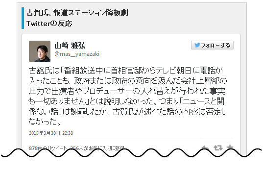 古賀茂明氏、報道ステーションで「菅官房長官をはじめ官邸にバッシングを受けた」と批判 番組降板の舞台裏をめぐって口論 菅氏は「TV局がどのような対応をするか見守っていきたい」と述べる。古賀茂明氏の発言に対し菅官房長官「事実に反するコメント、極めて不適切」BLOGOS 2015年03月30日 13:19引用元:http://blogos.com/article/109015/菅義偉官房長官は30日午前の記者会見で、27日放送の「報道ステーション」(テレビ朝日系)における古賀茂明氏の発言について「事実無根」と述べた。記者とのやりとりは以下のとおり。 記者:テレビ朝日の報道ステーションの古賀茂明氏の発言に関してなんですが、番組の中で古賀氏が"官邸からのバッシングを受けていた"と。菅官房長官に直接私に文句を行って来て欲しいと、菅さんが直接名指されているんですけれども、その受け止めをお願いします。 菅官房長官:私も番組は見ておりませんでした。しかしですね、その後で指摘をされてですね、YouTube等で見ましたけれども、全く事実無根であってですね、言論の自由、表現の自由は、これは極めて大事だと思っておりますけれども、事実に全く反するコメントをですね、まさに公共の電波を使った報道として、極めて不適切だという風に思っております。 記者:全く事実に反するということで、長官の方から何か措置というか反論というか… 菅官房長官:それは放送法という法律がありますので、まずテレビ局がどのような対応をされるかということをしばらく見守っていきたいという風に思います。 古賀氏、報道ステーションでの自爆テロ?3月27日、テレビ朝日系のニュース番組「報道ステーション」で、コメンテーターとして出演していた元経済産業省官僚、古賀茂明氏が番組の進行上の内容とは関連のないコメントをして、司会の古舘伊知郎氏と言い争いになる場面があった。イエメン情勢に関するVTRが流れて、中東情勢に関してどう思われますかと司会の古館さんがコメンテーターをしていた古賀さんに振った。そこで、古賀さんはそれに答えず、ちょっとその話をする前に、私今日が最後ということで、テレビ朝日の早河会長とかあるいは、古舘プロダクションの佐藤会長のご意向で私はこれが最後ということなんです。私はこれまで非常に多くの方々から激励を受けました一方で菅官房長官をはじめ、官邸のみなさんには、ものすごいバッシングを受けてきましたけれども、それを上回るみなさんの応援のおかげで非常に楽しくやらせて頂いたということで心から御礼を申し上げたいと思います。本当にありがとうございました。といったすれ違い答弁がされた。その後、古館さんは、今の話は私としては承服できません。と切り返し、古賀さんには機会があれば、企画があるなら出ていただきたいと相変わらず思っています。と述べた。話の内容としては、もともと不定期で出ていた準レギュラーであった古賀さんは官邸の圧力で降ろされたんだと思っているようにも聞こえる。憲法21条の言論の自由・表現の自由が保障されているわけですから、もし、官邸が圧力をかけて番組での発言を封じるようなことをしているのであれば違法になるだろう。古賀さんは事実に基づいた発言で非常に説得力のある方だったので、今回の件が事実に基づくことであればそれは大変なことであり、興味あるところでもある。しかし、古賀さんの憶測が先走りしてしまったのであれば、それはとても残念なことになってしまう。ちなみに、放送終了後、スタッフが古館さんの楽屋の前に集まりテレ朝は騒然としていたようだ。生放送であれをやられてしまったら、もうテロでしょと大混乱だった模様。菅官房長官が違法アップロード容認?今回の件とまったく関係ないのですが、ちょっと気になったので。報道ステーションの古賀氏の発言にあった、菅官房長官や官邸への批判について、官房長官の記者会見でのことである。菅官房長官の発言に、「番組自体は見ておらず、後で指摘をされてYouTube等で見ましたけれども・・」と言っていた。ちょっと待って、ちょっと待って~♪YouTube等ってなんですの?(笑)テレビ朝日は報道ステーションでの古賀さんの発言をYouTubeには載せていないと思われるので、菅官房長官が見たものは違法アップロードされたものである可能性が高い。これでは、違法アップロードを容認していると思われてしまいますよ。メディアに対する政府の距離感今回の番組降板劇、正直なところ視聴者側からすると具体的にどんな経緯があったかさっぱりわからないやりとりでした。そもそも何を根拠に言っているのかが不十分で残念なものでした。問題は、菅官房長官が会見で答えた内容にある。まず、政府としては事実無根であって、事実に反するコメントは極めて不適切と批判した。ここまでは、いつものことである。それに対して、官房長官の方から対応措置はなにかあるのかという質問に対して「放送法という法律があるので、まずテレ