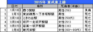 3/8~3/14に発生した鉄道の人身事故のうち、首都圏で発生した事故で列車の運転を見合わせた事象一覧■運転再開まで、平均68分。■JR武蔵野線 西浦和駅 (埼玉県)発生日時:2014年3月8日(日) 0時22分頃・東所沢~南浦和駅間の上り線の運転を見合わせ。・1:25頃、運転を再開。・私立大学4年男性(22)が東京発信濃大町行き団体臨時列車(列車番号:9760M)にはねられ死亡。・上下4本に遅れ、乗客約800人に影響。■西武拝島線 玉川上水駅 (東京都)発生日時:2014年3月8日(日) 11時08分頃・玉川上水~拝島駅間の運転を見合わせ。・11:48頃、運転を再開。・男性(40代)が拝島発西武新宿行き上り急行電車(列車番号:2324)にはねられ死亡。ホームから線路へ飛び込む姿を運転士が目撃。■東武東上線 新河岸駅 (埼玉県)発生日時:2014年3月8日(日) 19時52分頃・池袋~小川町駅間の運転を見合わせ。・20:55頃、運転を再開。・女性(60~80代)が池袋発森林公園行き下り急行電車(列車番号:1263)にはねられ死亡。■JR山手線 代々木駅 (東京都)発生日時:2014年3月9日(月) 0時14分頃・内・外回り電車で運転を見合わせ。・0:51頃、運転を再開。・当該列車 内回り■京王相模原線 京王堀之内~南大沢駅間 (東京都)発生日時:2014年3月9日(月) 0時36分頃・京王多摩センター~橋本駅間の運転を見合わせ。・1:35現在、運転を再開。・高校1年の女子生徒(16)が新宿発橋本行き下り快速電車(列車番号:2747)にはねられ死亡。女性生徒が線路上に飛び出すのを運転士が目撃するも間に合わず。・上下4本が遅れ、約500人に影響■JR中央線(快速) 東小金井駅 (東京都)発生日時:2014年3月9日(月) 14時55分頃・上下線で運転を見合わせ。・16:08頃、運転を再開。・男性が東京発高尾行き下り中央特快(列車番号:1419H)にはねられ死亡。http://matome.naver.jp/odai/2142588074936405901 - NAVER まとめ■東武日光線 幸手~南栗橋駅間 (埼玉県)発生日時:2014年3月9日(月) 18時19分頃【43号踏切】・東武動物公園~南栗橋駅間の運転を見合わせ。・20:20頃、運転を再開。・男性(40~50代)が浅草発南栗橋行き下り区間準急(列車番号:3603)にはねられ死亡。■JR川越線 大宮駅~日進駅間 (埼玉県)発生日時:2014年3月11日(水) 9時00分頃・大宮~川越駅間の運転を見合わせ。・9:59頃、運転を再開。・男性が新木場発川越行き下り通勤快速電車(列車番号:781S)にはねられ負傷。■京成本線 京成八幡駅 (千葉県)発生日時:2014年3月11日(水) 12時43分頃【八幡1号踏切】・京成高砂~東中山駅間の運転を見合わせ。・14:55現在、運転を再開。・男性(60~70代くらい)が成田空港発京成上野行き特急電車(列車番号:11A00)にはねられ死亡。降りた遮断機を通り抜けて線路内に入る男性の姿が防犯カメラに映っていたとのこと。http://matome.naver.jp/odai/2142604582495720901 - NAVER まとめ■JR高崎線 熊谷~籠原駅間 (埼玉県)発生日時:2014年3月11日(水) 18時54分頃【第三熊谷堤踏切】・上下線で運転を見合わせ。・20:07頃、運転を再開。・男性(40~50代)が上野発前橋行き普通電車(列車番号:941M)にはねられ死亡。■JR京浜東北根岸線 本郷台駅 (神奈川県)発生日時:2014年3月11日(水) 23時45分頃・0:16頃、運転を再開。・当該列車:南浦和発大船行き南行(列車番号:2115B)■JR中央線(快速) 武蔵境駅 (東京都)発生日時:2014年3月13日(金) 1時08分頃・三鷹~高尾駅間の下り線の運転を見合わせ。・2:00頃、運転を再開。・男性(50代くらい)が東京発高尾行き快速電車(列車番号:2403T)にはねられ死亡。 http://matome.naver.jp/odai/2142622664559633601 - NAVER まとめ■小田急小田原線 東海大学前~秦野駅間 (神奈川県)発生日時:2014年3月13日(金) 14時58分頃【東海大学前3号踏切】・伊勢原~秦野駅間の運転を見合わせ。・16:18頃、運転を再開。・女性が町田発小田原行き下り急行電車(列車番号:2013)にはねられ死亡。首都圏鉄道人身事故発生マップ首都圏鉄道人身事故発生マップ2015年1月~3月首都圏鉄道人身事故発生マップ2014年4月~6月首都圏鉄道人身事故発生マップ2014年7月~9月首都圏鉄道人身事故発生マップ2014年10月~12月新幹線さくらが乗客と接触 岡山―広島間で運転一時見合わせ産経ニュース 2015.3.12 14:47引用元:http://www.sankei.com/west/news/150312/wst1503120044-n1.html 12日午後1時40分ごろ、広島県福山市の山陽新幹線福山駅で、鹿児島中央発新大阪行き「さくら550号」がホームにいた乗客と接触した。 JR西日本新幹線管理本部によると、福山駅に停車するため列車が入ってくる際に接触した。乗客は救出され、けがをしているが、命に別条はないという。・・・ホーム設置のカメラ映像や運転士の証言などから、広島県尾道市の男子大学生(22)がホームから飛び降りた可能性が高いという。列車は緊急停車するも、間に合わず先頭車両がはね、反対側の線路に飛ばされた。ホームに柵はない。News Division XYZ カテゴリ別記事一覧上野発の夜行列車・名列車 駅と列車のものがたり発売日:2015年04月著者/編集:山田亮出版社:JTBパブリッシング本書の大きな特徴は上野駅の132年にわたる歴史と、上野駅を発着する各列車の解説、という2本の大きな柱から成り立っている。上野駅は1883年に開業以来、北