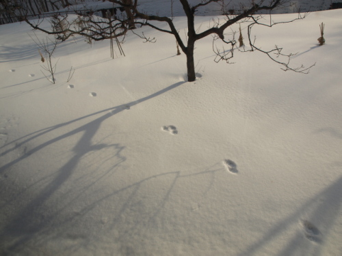 今年も庭に誰かの足跡が。なんの足跡ですかね?猫にしては大きすぎるし。犬はこんな足跡じゃないし。ぴょんぴょん跳んでる感じだもんなぁ。やっぱりキツネなんだろうか。いつか犯人を見てみたいものです。