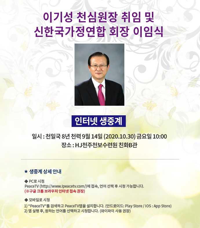 2.天地人真の父母様の深い愛と祝福の中で「李サンジェ神韓国家庭連合共同会長と天宙平和連合第4地区会長就任式」を下記のように実施しようとしますので意味深い行事になるように多くの心をお願いいたします。