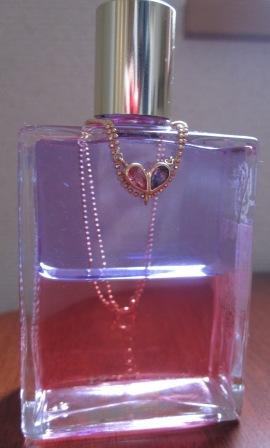 オーラソーマ56番「頭は天に足は地に(パープル/レッド)」です。 昨日、オーラソーマジュエリー展(販売会)があり、行ってきました。最初にコンサルテーションを受けました。今回選んだ4本のボトル1本目 106番 大天使ラツィエル (ミスティペールオリーブグリーン/ミスティライラック)2本目 56番 頭は天に足は地に(パープル/レッド)3本目 88番 翡翠の皇帝(グリーン/ブルー)4本目 10番 行って、木を抱きなさい(グリーン/グリーン)今回は、選ぶのに時間がかかりました。1本づつ、数分悩みました。自分としては、なんで選んだんだろう?と、???・・・となってしまう組み合わせです。なぁ~~んで1本目がラツィエル~~~???みたいな・・・今回は、ジュエリーを選ぶ目的があるので、この他にバースボトルの36番 チャリティ(パープル/ピンク) 9番 クリスタルの洞窟(ターコイズ/グリーン)も参考ボトルとして出てきました。先日受けた「オーラソーマジュエリーセミナー」では、数秘学から割り出したり、ボトルに隠れた色・・ということからその他のボトルが割り出され、選択肢に加えられるということでしたが、私の場合は上記6本のボトル以外は特に選択肢として出てこず・・・「この中でどれに一番惹かれますか?」と聞かれて、「56番」と答え・・「だったら、これがいいですね」と言われ、即決定!!となってしまいました。結局、普通に今のチャレンジボトルとなってしまいました。でも、バースボトル(36番)との関連もあるらしいし・・頭で考えず、即実行!!現実化!・・というのが今の課題のようなので・・まぁいいか・・・次に、ジュエリー選び赤とパープルなので、必然的に赤=ガーネット紫=アメジスト ということらしく・・石は選びようがないのか・・・と、ちょっとがっかり・・でも、そんなに高価そうな石じゃなくて良かったなぁ・・と思いながら始まったジュエリー選び・・・私はペンダントと決めていたけれど、デザインは様々・・・本当は石が大きいデザインを選びたいと言う思いもありましたが、とても高価らしい・・・また、ダイヤモンドをあしらっているものもあり、これも、おそらくかなり高価でしょう・・小さめの四角いカットの石をいくつか並べた上に水晶が被さっている大ぶりのものもありました。水晶がついてるとは!!いいかも!!・・と思ったけれど・・・普段使いしたいと考えているので、そうかんがえると、どうかな?それで、セミナーの時から「いいな」と思っていた、四角い石でボトルっぽく作られていて雫がぶら下がっているデザインととても小さな雫型の石が合わさってハートの形になっているデザインと・・だんだんに的が絞られてきた・・ハート型はとっても小さいので、たぶん他のよりは安価で買えるかな?という考えもありました。ただ・・販売員さんのお勧めは四角くカットした石を使ったものの方でした。そうね・・ハートのものよりは、石が大きいし、四角なので、安定を表すとのことでした。「実際に石を乗せてみましょう!」とサンプルの地金の枠にサンプルの石を乗せてもらって、どんな感じになるか試してみました。ガーネットとアメジストの組み合わせ・・なかなか素敵!!でも、ガーネットは色が薄め(紫っぽい)ロードライトガーネットが素敵!!シルバー色の地金より、ゴールドの方が華やか!!う~~~ん・・小さいハートだと、小さすぎて石が沈んで見えるかなぁ???「ハートの方は、他の石も選べますよ。赤にはルビー、紫にはタンザナイト」と販売員さんのお言葉・・・「タンザナイト!!!」私はタンザナイトって持ってない・・。ほしいと思っていたけど、ご縁がなくてなかなか購入できずにいました。こんなところで、タンザナイトが出てくるとは・・・!!!さっそく合わせてみたら、(ルビーとタンザナイト)小さなハートなのに、とても華やかになりました。同じデザインでも石が変わると、印象もとても変わります。ハート型にするなら、「ルビーとタンザナイト」で決まり!!ところが、ほかのデザインではタンザナイトが使えないそう・・・そして、もう一人の販売員さんが言うには、「オーラソーマの考え方では「紫はアメジスト」というのが一番忠実です。タンザナイトはロイヤルブルーでもあるので。」ふ~~ん・・やっぱり、アメジストの方がいいかなぁ??販売員さんは、四角い石のタイプを勧めたいらしかったです。小さいのより、大きい方が似合う、目力がある・・・などと言われてしまいました。(そうかなぁ~~???)タンザナイトとルビーの組み合わせは、ぱっとして華やかだけど・・・じっくり落ち着いていて、じわじわとパワーを発揮するのはアメジストとガーネット・・何度も何度も石を入れ替えてもらいながら・・・出した結論。それは、「ハート型のルビーとタンザナイト」やっぱり、最初の直感にしたがった結果・・となりました。3番目、4番目に選んだ「未来」を表すボトルは、両方ともタロットカードの側面では、「運命の輪」を表します。ルビーとタン