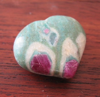昨日の17時頃から新月となりました。昨日、届いた石・・・ルビーインゾイサイトです。きれいに六角形に結晶したルビーの周りをゾイサイトが薄く囲っています。だから、ルビーインゾイサイトと言われます。そのまわりの白い部分や広く緑色になっている部分は、おそらく、フックサイト(雲母の仲間)だと思われます。お店では「ルビーインゾイサイトのハートシェイプ」として売られていましたが、細かく言うなら、ルビーインゾイサイトインフックサイトってことですね。コンビネーションの石としては、ポピュラーですけれど・・ハート型はなかなかないかも。お値段もお手頃だったので、ついついオーダーしてしまいました。この石はルビーの部分が本当にきれい!!思わず見とれててしまいます。手のひらにすっぽり入るくらいの、けっして大きな石ではないのですが、ほぼ、六角形に結晶しているのが3つもあるので、驚きです。*こちらは裏側ルビーの赤とゾイサイトの緑・・・赤と緑は補色関係にあるので、正反対の性質を示します。けれど、共生している状態です。この石は「自己と他者」「他者と他者」「人それぞれ」そんなキーワードを持って偶然にも新月の日にやってきたので、これらのキーワードを意識して生活してみようと思います。*ちなみに・・タンザナイトは青紫色のゾイサイト、チューライトはピンク色のゾイサイトの ことをいいます。こちらもご覧くださいね。★屋久島旅行について載せています。(今後も加筆の予定)(屋久島紀行 表紙)(Chapter 1)(Chapter 2)★Peaceful Light 石に関するページです。画像が多いです(はてなダイアリー)その他フリーページいろいろ・・ご覧くださいね ☆ハンドメイドお菓子レシピハートツリー・ホワイトガナッシュクリームケーキオレオクッキー・チーズケーキ ☆きづきさん主催「チャクラギフトワーク」参加レポートハートチャクラギフトワークスロートチャクラギフトワーク ☆トライゴーニックとともにトライゴーニックとともにトライゴーニックとともに Chapter 2 ☆ジェーンアン・ダウ ワークショップツアー in マウイ島 レポート(2005年ゴールデンウィーク)Chapter 1 ~3 ☆マジカルツアーinマウイ島レポート(2005年1月に参加しました) Chapter 1~13