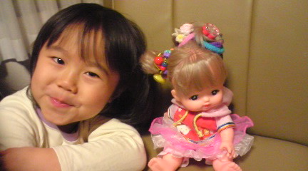 お人形の髪の毛をアレンジしてます。