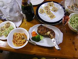 彩の国の今日は晴れの予報ですが、朝はちょっと雲が多く暗くて寒い朝です。今の Pearun の部屋の様子です。(時間限定Liveです。)・朝のLive終了しました。 パスタと焼き鳥 メインのケーキ フルーツの缶詰をミックスしたデザート チョコレートケーキ世間並みに少し賑やかな夕食になった、クリスマスイブのご馳走です、食べ過ぎて久しぶりにお腹いパイで苦しい状態になってしまいました、お酒もいつもの熱燗からシャンペンにしましたのでお腹の中でシャワーーとなっているのもてつだっている様です。