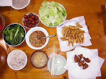 今日は朝の内曇りでその晴れの予報ですが、今は曇りで部屋も少し暗い状態です。今の Pearun の部屋の様子です。(時間限定Liveです。)・朝のLive終了しました。昨日の夜は唐揚げです、揚げ立て熱々は柔らかく結構おかずになります、付け垂れはポンズにネギのみじん切りを入れた物で、このネギポンズは結構美味しいんです。他はポテトフライ、サラダこちらもネギポンズで食べても美味しいです、それにお浸し、トマトなどでした。それにしても見るからにシンプルですね。