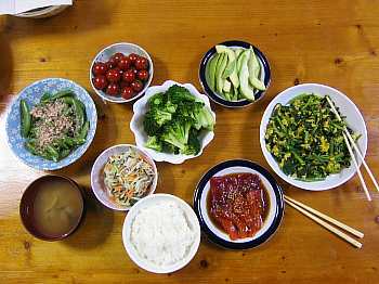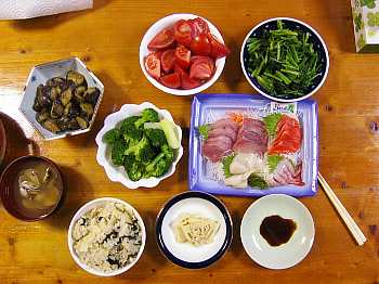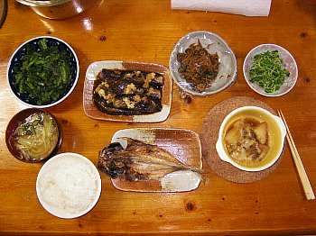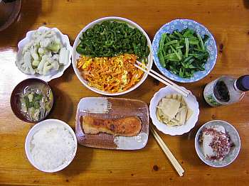 ネタに困った時は毎度の定番で失礼します。昨日の夕食はメインがアジの開きで他に、ポテトのチーズ焼、茄子の生姜醤油かけ、菜の花の胡麻和え、胡瓜と生姜の古漬け作り、カイワレ大根のお浸しでした。ご飯は久しぶりに白いご飯です、何故かと言うと単に雑穀を買うのを忘れて、無かっただけの様です。