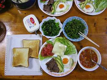 今日は1日雨の予報で、今は部屋も暗い状態です。今の Pearun の部屋の様子です。(時間限定Liveです。)・朝のLive終了しました。昨日の夕食は久しぶりのパン食で、おかずと言うか付け合せは牛肉、卵焼きアボカド、トマト野菜などと、トマト味の野菜入りスープにピーマン炒め、それに菜の花のお浸しでした。それなりに美味しかったですけど、パンは腹持ちが良くないで、遅くまでパソコンに向かっていると、ワインでつまみなんて事になるのが欠点です。なぜか夜遅くに呑む酒は、日本酒の熱燗でなくワインになっちやいます、気分的にくつろげるって感じしちゃうんですよ。