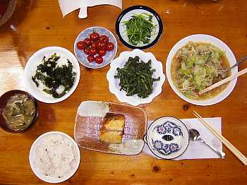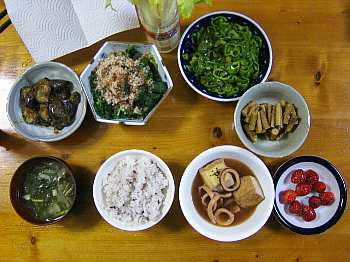 偶然新鮮な玉子を手に入れました、この白身の盛り上がりと丸みがしっかりした黄身が新鮮さを物語っています、こなん玉子は玉子かけご飯で食べたいですよね。ですが、それは朝食に回して夕食は玉子料理って事でオムレツでした、中は定番の玉ねぎや挽肉などが入っています、他に茄子揚げに生姜醤油をかけた物と冷蔵庫のあまり物で、お浸しや胡麻和え、プチトマトなどでした。