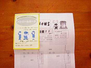今朝郵便ポストを見たら、こんなパトロールカードと書いた物が入っていた。カードにはパトロールした時間0時20分頃と、交番と担当者、電話番号などが記入されていた。カードと一緒に自転車の鍵の種類と開け易い鍵と、開け難いの種類などが書いた冊子が付いていた。最近は警察も色々と努力されているんですね、ご苦労様な事です。
