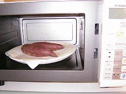 電子レンジのオーブン 焼きあがった芋昨日スーパーで衝動買いして来たさつま芋を早速焼き芋にしました、オーブン付きの電子レンジをオーブンに設定し温度180度時間45分にしてスタート、後はひたすらチンの音を待つだけです。芋の下にはキッチンペーパーを敷いて、芋から出る汁で皿が汚れない様にします、タイマーが切れたら楊枝を太い所を狙って刺して見ます、スーと刺されば出来上がりです。オーブンが少し冷めるまで暫く芋を入れたまま、余熱で熟成させると甘味が増す様な気がします。←中はこんな感じです