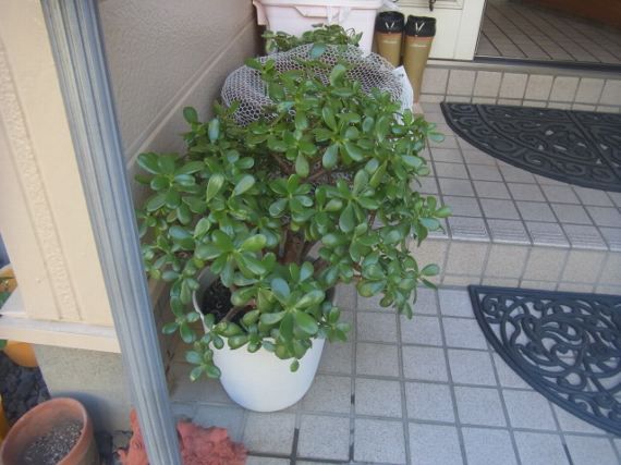 冬の寒い間3階の部屋に退避していた金の生る木を、暖かくなって来たので玄関先に出しました、結構大きな木にそだったので、運ぶのが大変でした。