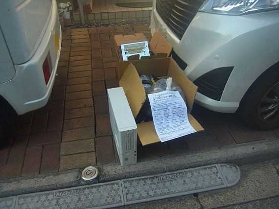 さていよいよ不用品回収の日が来たので、不用品を詰め込んだパソコンや、捨てたい電子部品を詰めた段ボールに納戸に有った、蛍光灯型ダウンライトなどを、纏めて家の前の道路脇に並べて、配られたチラシを貼り付けて置きました。