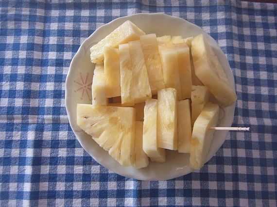 早速冷蔵庫に入れて冷やして、夕方カットして食べて見ました、甘みが強く芯まで柔らかで食べる事が出来、パイン独特のイガっとした感じも無く、とっても美味しいパインですた。