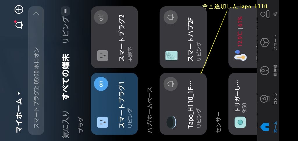 早速Tapoアプリを開いて、右上の+マークをタップして、Tapo H110を登録しました、次に登録したTapo H110に操作する家電を登録します。