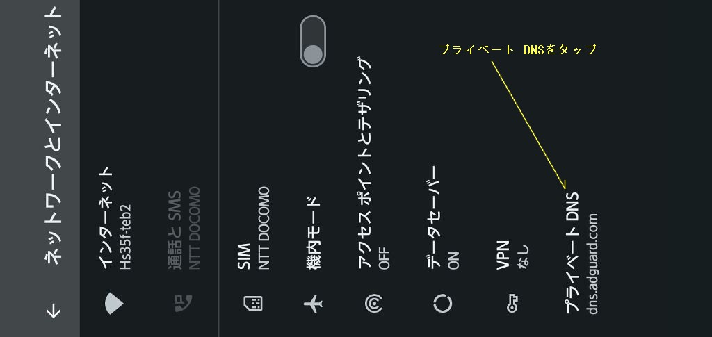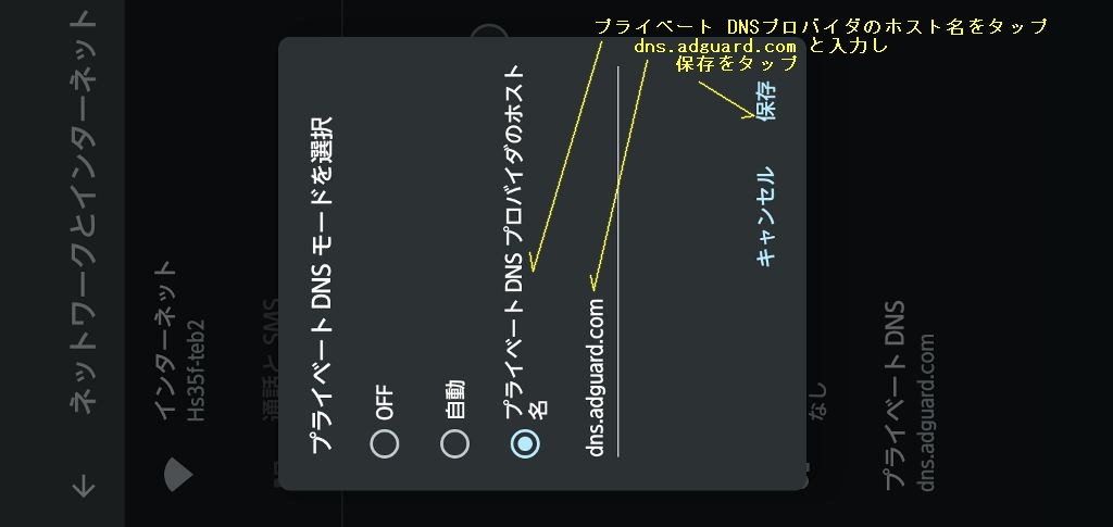 ・プライバシーDNSプロバイダのホスト名を選択し、ホスト名に