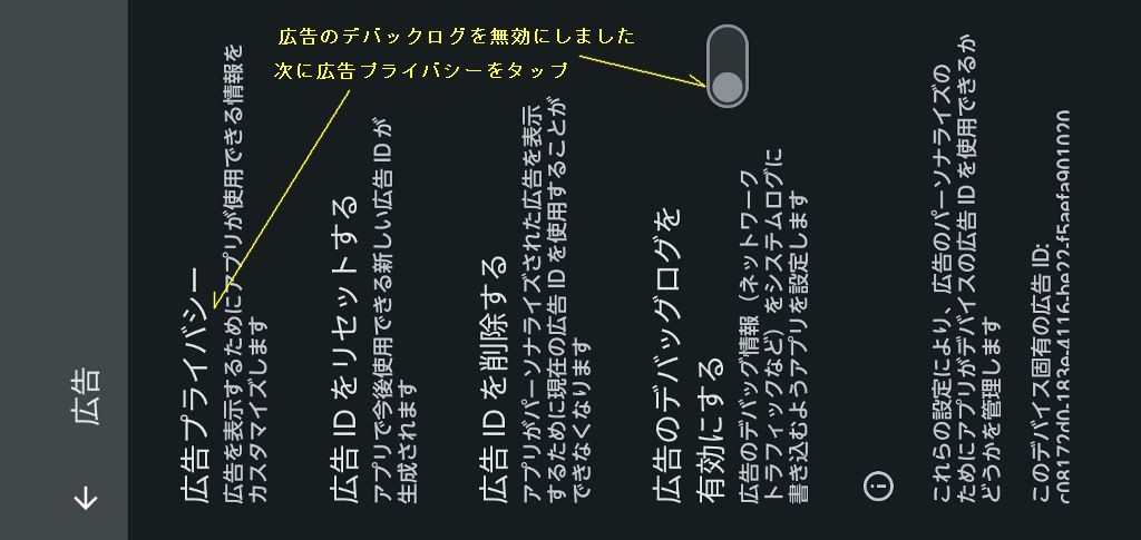 今回はとりあえず、広告のデバックログを無効にした、位置情報も思いましたが、スマホを探すときとか、地図など現在地確認などに影響しますので、やめておきました。