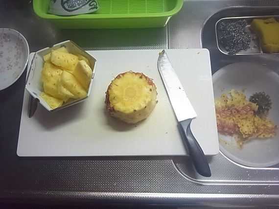 バナナは朝食用で、毎朝1本食べる様にしています、奮発してゲットして来たパインは、良く冷やしてから、輪切りにして皮むきをしました、台湾パインなので芯まで美味しく食べられます。