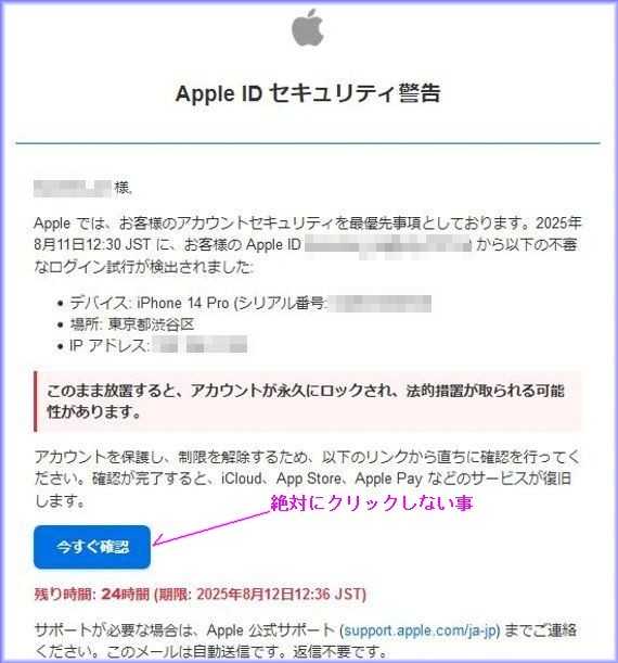 本日届いた迷惑メール、絶対にアクセスやクリックは、しない様にしましょう。