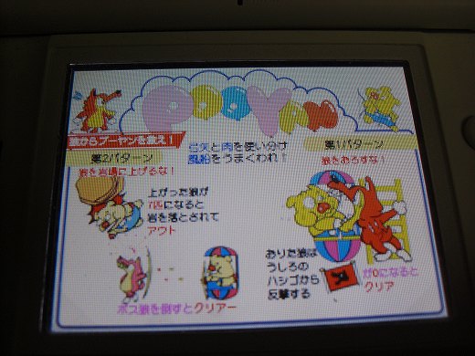 こんばんわ、バリットくんです。今日もお仕事、結構激務チックに振り回されました。で、仕事終わって会社で麻雀、全くイイとこなし。10局ほど経過して振込みは1回だけ(追っかけに親マン振込み)なのに持ち点は7千点とか・・・なので、もう帰りたくなって、リーチに差し込んで飛びで終了、チクソウ・・・まあノーレートだから出来る事ですがね。昨日ゴンちゃんからのコメでプーヤンがどういうゲームか今一思い出せないと。なので画像をうpしときますねwゲームの説明はこんな感じ。当時主流のテーブル筐体に挟んでありましたね。ゲーム画面はこれ。正にやられた瞬間ですがwで、生肉が関係してたってのは正解wプーヤンが乗ってるゴンドラの右上に生肉があり、回数制限があったと思いますが、これを投げる事により、タイミング次第では画面左を降りていく敵狼を一層することが出来る、現在のボムの様な役割ですね。思い出せましたかー?これだけじゃ何なんで、ちょっと動作確認してたソフトの中から一本。これなーんだ?携帯互換機の液晶がしょぼいのでデジカメで撮ると背景が変な縞模様になってますがwヒントは有名映画がモチーフになってます。これらか某所でアニメを鑑賞しなきゃなので、また明日~(^^)ノシ