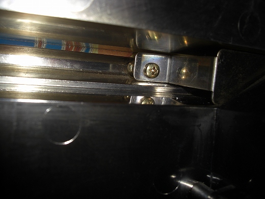 こんばんわ、バリットくんです。なんか、最近また暑くないですか?朝晩は結構涼しいのに、昼間は結構気温が上がりますよね。今日も雨がぱらついてるのに、結構蒸し暑く、会社の事務所(PC8台稼動)では暑くてクーラーかけてました。猛暑の次は暖冬なのですかね?夕べ、ブログの更新をした後、久しぶりに一騎当千の画像でも採取しようかと電源オン。・・・物凄い違和感があるのですが、それがなにか判らず、しばらくプレイ。暫くして気がつきました、下パネルの蛍光灯が点いてない事にw蛍光灯の買い置きはあるので(ダイソーで売ってるフツーの10形でおk)交換しようとドア裏をじっと眺める。通常下パネルって4~6っ箇所、爪で止まってるので、それを裏側からこじると簡単に外れるじゃないですか。ところがこの筐体、何処にもそれらしいものが無い。とりあえず見える限りのネジを外してみましたが・・・・・下皿が外れただけとか・・・orzとりあえず色んなワードでググってみたんですがノーヒット。なので夕べは諦めて丸くなって就寝。今日になって、そういや、あの大御所が同じ実機を持ってたなと思い出し、メルにて問い合わせ。すると、さすが大御所、専門外wの実機の事も詳しいですね、すぐ教えてくれました。なので、同じ悩みで困ってる同胞方の為に(大げさw)タイヨーの実機の下パネルの外し方を伝授wとりあえずドア裏のこの部分のネジを外します。反対側にも同じネジがついてて、このプレートがパネルを挟んで固定してるようです。で、ネジを外したら、パネルの表側からぐっと押し付けるようにして上にずり上げるとパネルの下に隙間が出来ます。この隙間にドライバーかなんかを突っ込んでヤサシーク手前にこじると、びっくりする位簡単にパネルが取れました。あ、この際ヤサシークやらないと大切なパネルに傷がつくので注意です。僕のは・・・すでに傷が付いてましたが、まあフレームの影に隠れてる部分なので見なかった事にしますw無事外れました。蛍光灯は真っ黒になってますね。で、さくっと交換してパネルの隠れてて磨けなかった部分を磨いて組み付け。はい、カンセーです。所要時間は5分位でした。で、大御所に写メで報告をいれると「そのSLOTシールを他のに取り替えなさいw」との新たなミッションがw取りあえずホールで証紙ナンバーを調べてきますw後はフォトショでちょちょいと加工しますか。あ、そだ、同じ悩みの方々wの為に適当な検索ワード貼っときますね。タイヨー実機 パネルの外し方パチスロ一騎当千 パネルの外し方では、また明日~(^^)ノシ追記えっと、パネルの外し方で追記です(汗)パネルを上から押さえ込んでるこのプレートも外して下さい。白いポッチを引っ張ると簡単に外れます。反対側にも同じものがあるので同じように外して下さい。