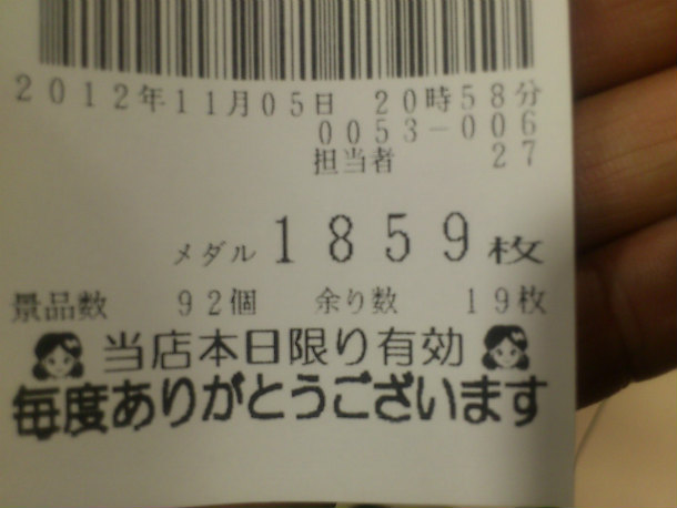 こんばんわ、バリットくんです。まず報告。ついにツイン3でマイスロでのキュンガチャをフルコンプタセーイしましたwいやー長かったなー。お金かからないんでコツコツとコインを貯めてガチャ回して・・・何度もかぶって多分凄い枚数引いてると思うんだ。ソシャゲで課金しながらやってる人ってお金持ちだよねwさてさて、一昨日久しぶりに4パチ打って来ました。と言っても甘海なんだけど良さげなんで座ってみたら1kで22回程のお宝台だったのね。で、オスイチで当たったけど単発。持ち玉で回してる間も常に保留が3個程度あるのね。けどもその後はなんにも起きず10k打ち切って終了・・・orz最後まで回転率は落ちず、ミドルとかだったら続行してたかもだけど見切りを付け・・・もやもやしてるんで1パチへ。で、座ったのは甘北斗慈母。これがまた0.2kで当たってしかもハイパーボーナスとか、引きが強いんだか弱いんだか(^ω^;)その後時短で一回当て一箱サラ盛りになったとこで空いてた攻殻機動隊に移動して・・・全呑まれで泣きながらキタック。んで昨日、仕事用PCのマウスが突然ヌッ壊れて仕事オワテ買いに行きました。さすがは信頼と実績のバッキャロー、何の前兆も無しに昇天だよヽ(`Д´)ノプンプンんでもあの左右非対称の親指が当たる部分が深くえぐれてるデザインが好きなんでやっぱり同じ物を購入。ええ、バッキャローの製品は使い捨てるつもりの度量がないと使えないよw目的も果たしたし帰ろうかと思いつつ・・・隣がパチ屋なのねw以前神たま2の設置があるはずなのにな無かったお店。念の為(爆)一応巡回に。したらば・・・あったよ( ゚д゚)ポカーンええ、前回見過ごしてたのは緑枠のダイナムパネルだったせいw因みにダイナムとは縁も所縁も無いお店なんで単純に中古導入なんだろな。見つけた以上は打たねばと着席、因みに5スロで換金率は22枚(等価だと5.5枚相当)。その心意気が通じたのかわずか3回転でビッグ♪終了後のチャンスゾーン中に豪華な襖が閉まりみこし祭り突入♪うまいわー、漏れパチスロうまいわーとかミサワっぽく思うwけども上乗せなしの単発終了、ベルナビなんか3回しか来なかったもんね(泣)そのあとちょいと回すもレア役なんぞは全く落ちず、隣の真田SPが気になってしょうがなかったんで300枚ほど持って移動。したらは、今度もわずか5回転でビッグw終了直後、押し順を当て見事初バナナwやっぱ漏れパチスロうま(ryまあ、何も無しであっさり終了ですがね・・・(´・ω・`)それでも500枚ばかしのコインが出来たんでこれで遊ぼうと思い続行。取り敢えずこの白ワンピ水着は押さえとかねばとかアホな事をやってたのよ。したらば全てはここから始まったwリーチ目頂きましたw無事再度ビッグを引き、そのビッグ中になんか揃ったw一回揃うと最大3回まで揃うらしいけど、この時は30×2。たったそんだけかよと思ったけど実は内部では偉いことになってた様子(^ω^;)仕様もよく判ってないんで( ´_ゝ`)フーン程度だったんだけど、ART準備中から夜画面。冊子を見ると常夏(通常ART)のゲーム数が減らないのかーお得だねーとか呑気に消化。んで、バナナスプラッシュに突入。上乗せ特化ゾーンとか言いながら全く仕事しないバナナ。それでも昼画面に転落するまでバナナ13本ゲトwバナナおいしいれす(^q^)で、初めて常夏突入としたけどポチポチG数乗ってて130程になっててね。んがそこからまだまだガンガンバナナに入るのな。同時にヌッ壊れたようにボヌスが2桁G数で当たり始める(^ω^;)この演出が100パー当たるwこれって確定演出?あ、写真は謎のイケメンが写り込んでるんでちょっと加工してますwその後も300程のハマリを乗り越えストック機の様に当たる当たるw21時頃終わらないよーとかツィートしてる余裕もあったんだけど・・・ずっとバナナに入りっぱなし。初期G数の130は減るどころかじわじわ増え、22時頃には200オーバー。なにこの永久機関(^ω^;)乗るG数は大半が10とかだけど他機種の50Gとかに匹敵することを理解し始め嫌な汗が流れだす(^ω^;)そこから多分西日本で五本の指に入るくらいに慌ててる人だったと思うw合間に都合6回のコイン補給でタイムロスされつつ最終ここで時間切れ終了・・・チクソウ・・・(´・ω・`)結局常夏のG数は殆ど減らなかったよ。時間さえあれば万枚いってんじゃね?約3時間でこれだから。最後に精算ボタンを押したらコインが切れて7回めの補給を受けたのにはワロタw閉店間際ボッチでコインを流し大事故終了w前日の負けも取り返しマウスの代金も取り返してお釣りが来たよ♪いやー、真田SP面白いわ、欲しくなったよ。ね、つっくんwではではノシ