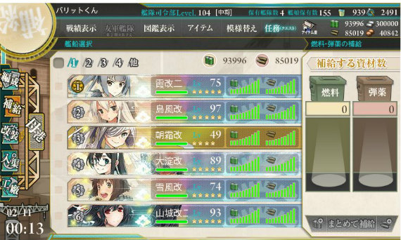 こんばんわ、バリットくんです。さーいよいよ冬イベ始まったねー。呉鎮守府は何やらサイバー攻撃を受けてるとか。どこの暇人だよ、迷惑だよね。幸い我が鎮守府はそんなこともなく平穏?つったら変かwまあ通常通りですな。んで、なんか知らないけど我が家の回線速度がスゲー安定してる件。早朝をピークにジワジワと回線速度が落ちて22時を回る頃にはADSL波の速度しか出んくてイライラしてたんだけど今週に入ってあれ?ッて感じで速度が安定して出てる。ちょっと前に設定いじって最適化してLANポートも交換してそれでも若干しか改善なかったのになんでだろ?後思い当たるのはちょっと前にヤフーから回線速度云々を口実にした営業電話が掛かっててその時に回線速度に関して相当辛辣に苦情を訴えたくらいかw要約すると「おめーんとこ完全にトラフィック足りてねーじゃんか!」ってな事を言ったなーそういやwまあ、原因はどうでもいい、このイベ期間に改善されたのは非常に喜ばしい♪さてさて冬イベ。初日は見といいつつやっぱりウズウズwまだ情報出揃ってなかったけど今回札が付かないってんでじゃあお試しに一当てしてみるかと出撃。勿論甲で。編成はこんな感じ、装備は対潜装備マシマシで1-5の乗りでいいかとwカ号はあってもなくてもいいかな、一長一短だしね。潜水棲姫さんキタ━━━ヽ(∀゚ )人(゚∀゚)人( ゚∀)ノ━━━!!w礼号組もそこそこ育ってるんでルート固定してサクサクと半分ほどゲージ削って満足して初日はお終い。あ、山城さんは艦載機の搭載数が少ないのに気がついてすぐ伊勢さんにチェンジしたおwで、明けて翌日、ちょっと早起きして弁当作ってさくっと突破w後でまとめサイトとか見たら姫硬すぎとかゲージ削り切ってんのにもう60回以上はまってるとか阿鼻叫喚が(;^ω^)俺は運が良かったのかな?うん、いいみたい♪さくっと瑞穂たんゲットン♪んで無事ご褒美もゲットン♪んで、夕べ仕事から帰ってきて飯食って即PCにかじりつきE-2出撃!編成はこんな感じ。装備はロケランと三式弾マシマシでwここも大してハマらずスルスルとボス戦へ到達。面子を見ると、ボス・補給艦×3、PT群×2で楽勝じゃーんとか思ったらPTがほぼ雑魚に格下げになってる代わりに補給艦の硬いこと(;^ω^)ご存知のように元々HPが高いんで昼戦2周しても健在とか(;^ω^)んでも夜戦に持ち込めばこの引き籠もりねーさんw防御がガバガバなんで瞬殺可能w最終形態もグラが変わって呼び名も・・・集積地棲姫ー壊・・・かwwwいwww改じゃなくて壊れるの壊wwwはwwwらwwwいwwwたwwwいwww何やら切れてらっしゃるようですが相変わらず防御ガバガバwんがここで夕べはゲージを削り切ってんだけど事故大破が多発したんで一旦終了。バケツの消費はまあまあの50個程度だったし、資材、資源は遠征をずっと平行してやってたのとクエクリアやらなんやらでむしろ増えてる件www明けて本日やっぱり早起きして・・・以下略ここでもラスダン大してハマらずさくっと突破♪大淀さん、見せ場作ったねー。つか艦これきゃぷちゃ、ビタ押しのタイミングが中々シビアだなおいwこれ連打で連写出来ればいいのになー。この面いかに無傷で夜戦にもつれ込むかだね。昼間は硬い補給艦も夜戦では紙装甲だよwご褒美の初月ゲットン♪ボクっ娘はいいんだけど・・・ちと目つきが悪いな・・・秋月、照月(この娘は持ってないけど)までとは雰囲気が違うねー。ともあれ順調すぎるほど順調にE-2突破!E-3解放条件のクエも問題なくクリアしてE-3開放。いよいよE-3突入だよ。次は連合艦隊&輸送任務なんで資源の溶け方が加速するんだろうな(;^ω^)一応それも考えてここまで支援艦隊一切出してないからね。今回は二度目の甲勲章狙ってくよーwではではノシ