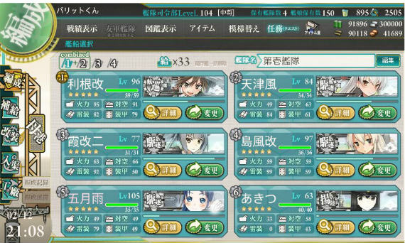こんばんわ、バリットくんです。いやー今日の天気の凄かったこと。1日雨だったけど昼前から時化だよ、時化。20時ごろは雷も鳴ってたけどやっと天気も落ち着いたかな?明日は晴れるみたいです。で、まるで今日の天気の様に大荒れの冬イベE-3輸送作戦。まず編成はこんな感じでスタート。あきつ丸に烈風系ガン積みして制空を取りに行ったが低速艦なんでどうしても道中航空戦マスを経由してしまう。そこで余計な燃料食って回避率が悪くなるっぽく初戦こそサクッとA勝利したもののそこからドロハマりしたんであきつ丸をスタメンから外して鈴谷にチェンジ。鈴谷に瑞雲系をガン積みして無理クリ制空を取り2戦ある潜水艦マスも有利に進める作戦。これが奏功して以後順調にゲージを削る。途中事故大破を何度も挟みつつなんとか輸送任務完了(`・ω・´)ゞその間特にレア艦のドロップは無し、うん、平常運転だわ・・・(´・ω・`)いいんだよ、俺はイベントクリアに重きを置いてるんで突破報酬以外のいわゆる掘りはあんまり好きじゃないの。そりゃ出てくれりゃ嬉しいけどさ・・・途中のLマスでグラ子が出るらしいんでなんとか削り中に出てくれることを祈るわ。無事輸送完了したんで壊滅作戦に移行。編成はこんな感じ。いやーアブちゃん育てといて良かったよ。ハイパーズと合計3隻で開幕雷撃できるから露払いが捗るーwはい、重巡棲姫さんキタ━━━ヽ(∀゚ )人(゚∀゚)人( ゚∀)ノ━━━!!w初戦は無傷でボス到達しあっさりS勝利。これは?と思ったけどやっぱり甘くないよね。2回戦目はC敗北・・・だって初戦と面子が変わってるんだもん。やっぱ決戦支援艦隊導入しないと厳しいやね。明日も仕事なんで一削りしたとこで今日はお終い。まだ始まったばかりだからね。ではではノシ