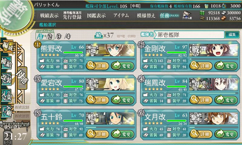 こんばんにゃー、バリットくんです。もう夏か?夏なのか?連日クッソ暑くて参るんだが。さてさて、リセットかまして丙に変更した艦これ、流石丙、サクサク進みますな。難易度自体それほど出ないとはいえ1回大破撤退したのみでほぼストレートで突破!丙なんで当然報酬も少々セコイが全部許す、ワーイヽ(゚∀゚)メ(゚∀゚)メ(゚∀゚)ノワーイまさかの酒匂がご降臨♪今イベで今んとこ唯一のレアドロでゴワスwとまれ、取り敢えず前段作戦完了(`・ω・´)ゞ明日より新海域に出陣でっす。んでんで、いつの間にかレベルが上ってた艦むすが・・・嫁いできました♪第6婦人、球磨型 3番艦 重雷装巡洋艦、北上さんです。いやー、この娘にはホントにお世話になってます。装甲は薄いけどココイチのスナイプに何度助けられたことか。あのポワッとしたマイペースなセリフ回しもいいっすなー。出来れば婚儀でもそっとデレて欲しかったw後にももう何人かフィアンセ(爆)が控えてるんでイベが終わったらもう一頑張りだw今回も家スロに全く触れずにではではノシ