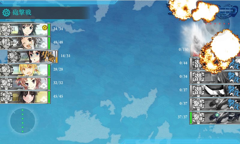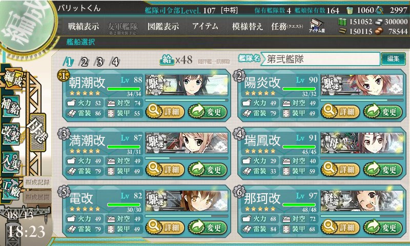 こんな編成で甲にて現在奮戦中。ドラム缶があんまり積めない編成なんで時間がかかりそう。しかし色々嫌な予感しかしなんだなー。取り敢えず頑張るけど明日も朝が早いんで風呂入って寝るよ。ではではノシ
