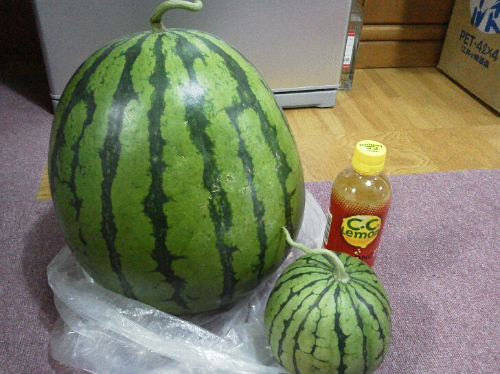 お久しぶりです。暑いですね~~~大きいスイカでしょ、隣は、マザーボールの小さいスイカ・・こんなに違うのよ!実家で、収穫した、スイカです。甘くて、おいしかったです。